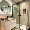 Aluminiumprofilerna i elegant matt svart betonar en tydlig, modern design. Du kan gärna fortsätta denna look med fler svarta element i ditt badrum.